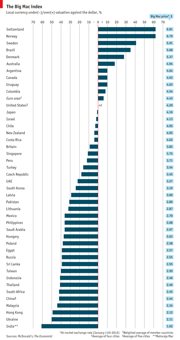 El tipo de cambio que igualaría el precio de un Big Mac suiza con un americano es un SFr1.55 al dólar, el tipo de cambio real es de sólo 0,96.